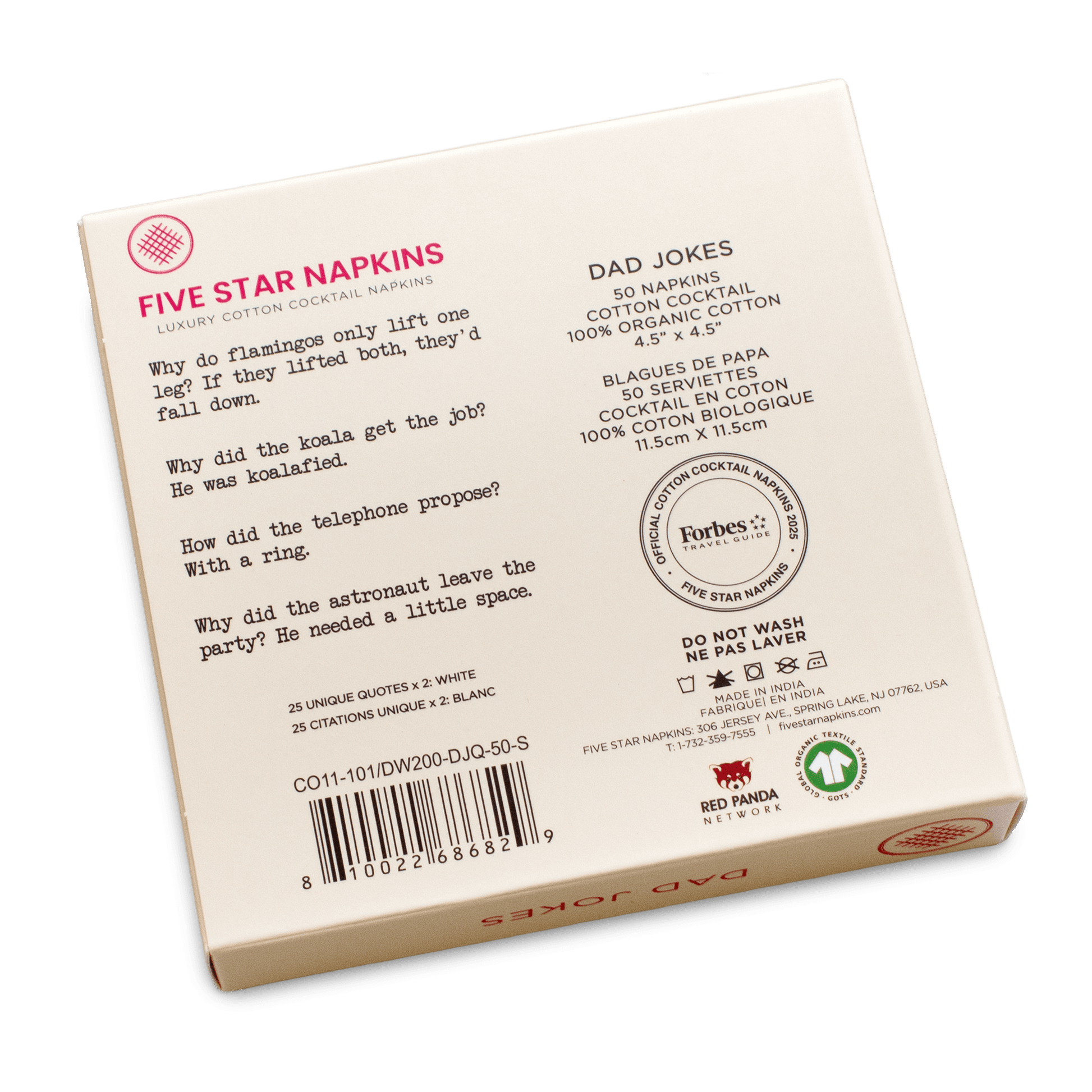 Experience a new kind of entertaining with these white cotton Dad Jokes Cocktail Napkins. Crafted from 100 percent organic cotton, each case features a generous 1200 napkins, conveniently packaged as 24 packs of 50. These crisp white napkins are perfectly sized at 4.5 by 4.5 inches, and each set offers two of every one of 25 unique dad jokes, ensuring every guest receives a delightful surprise.
